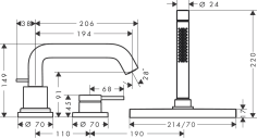• состоит из: однорычажный смеситель на край ванны на 3 отверстия, ручной душ, держатель для душа, шланг для душа